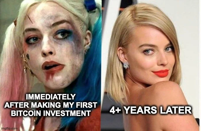 Meme: A before and after of Margot Robbie in the movie Suicide Squad vs. on the red carpet all glammed up to represent me immediately after making my first Bitcoin investment vs. 4 years later